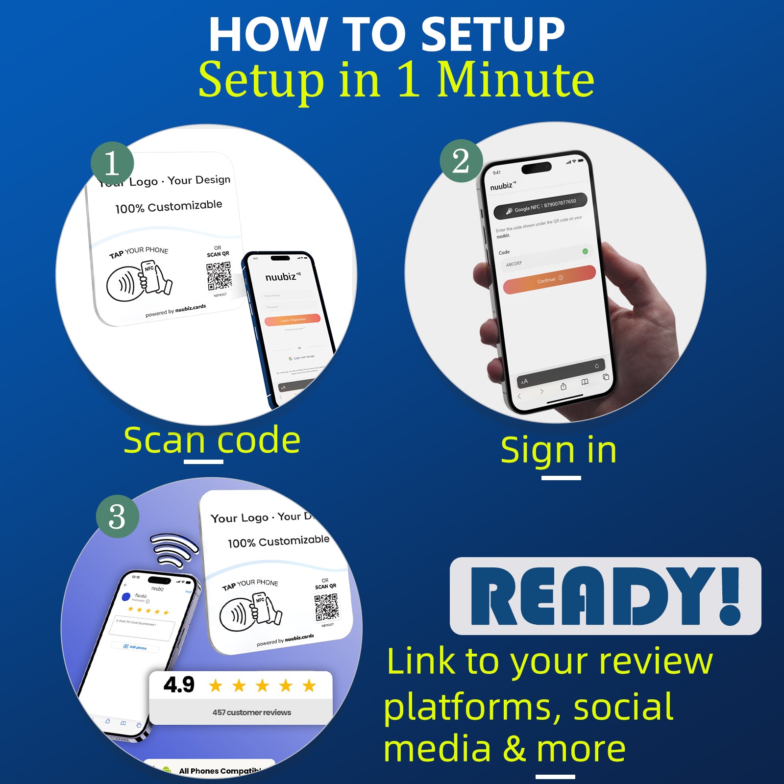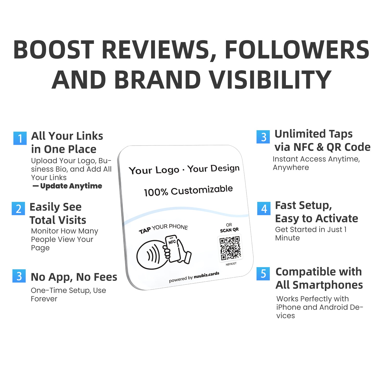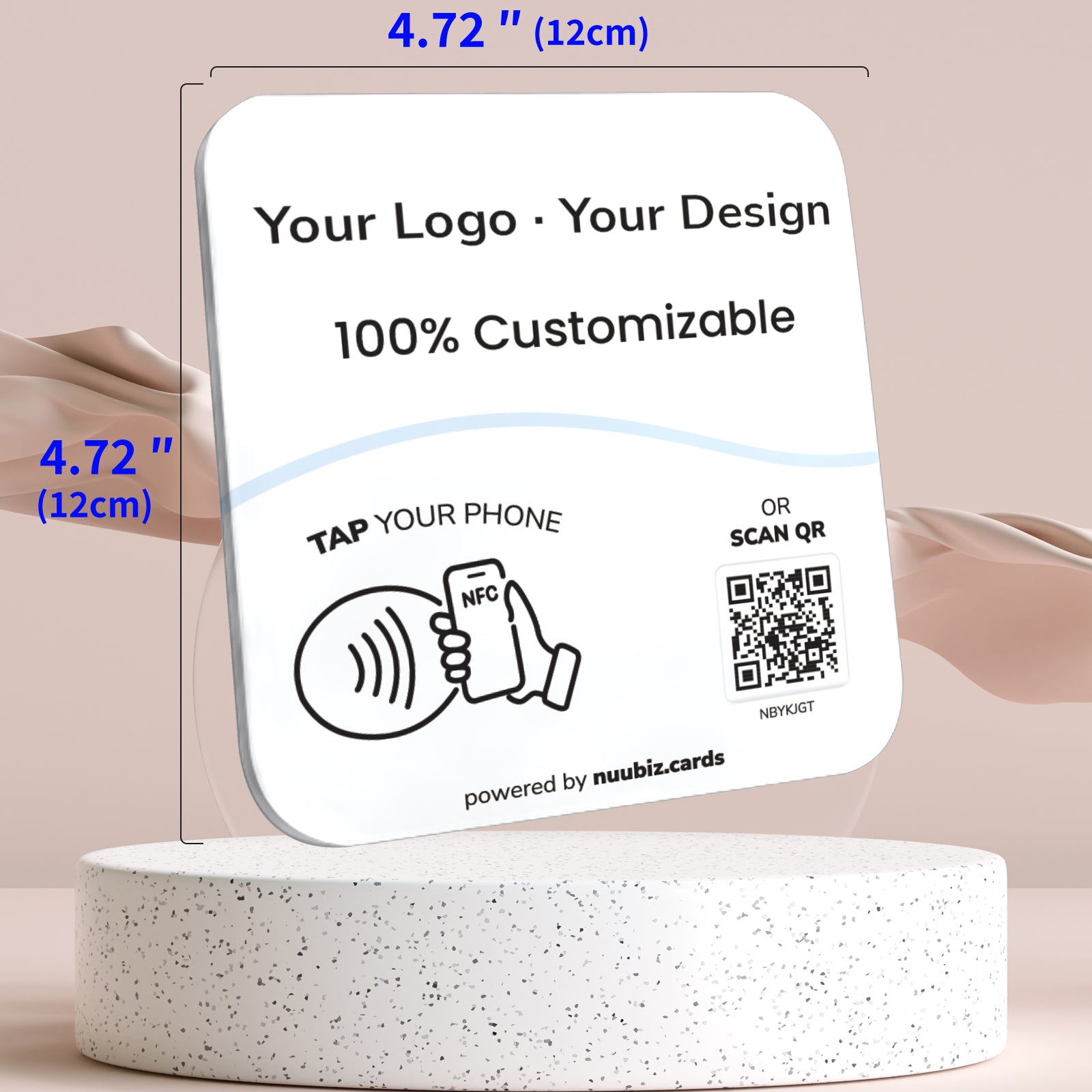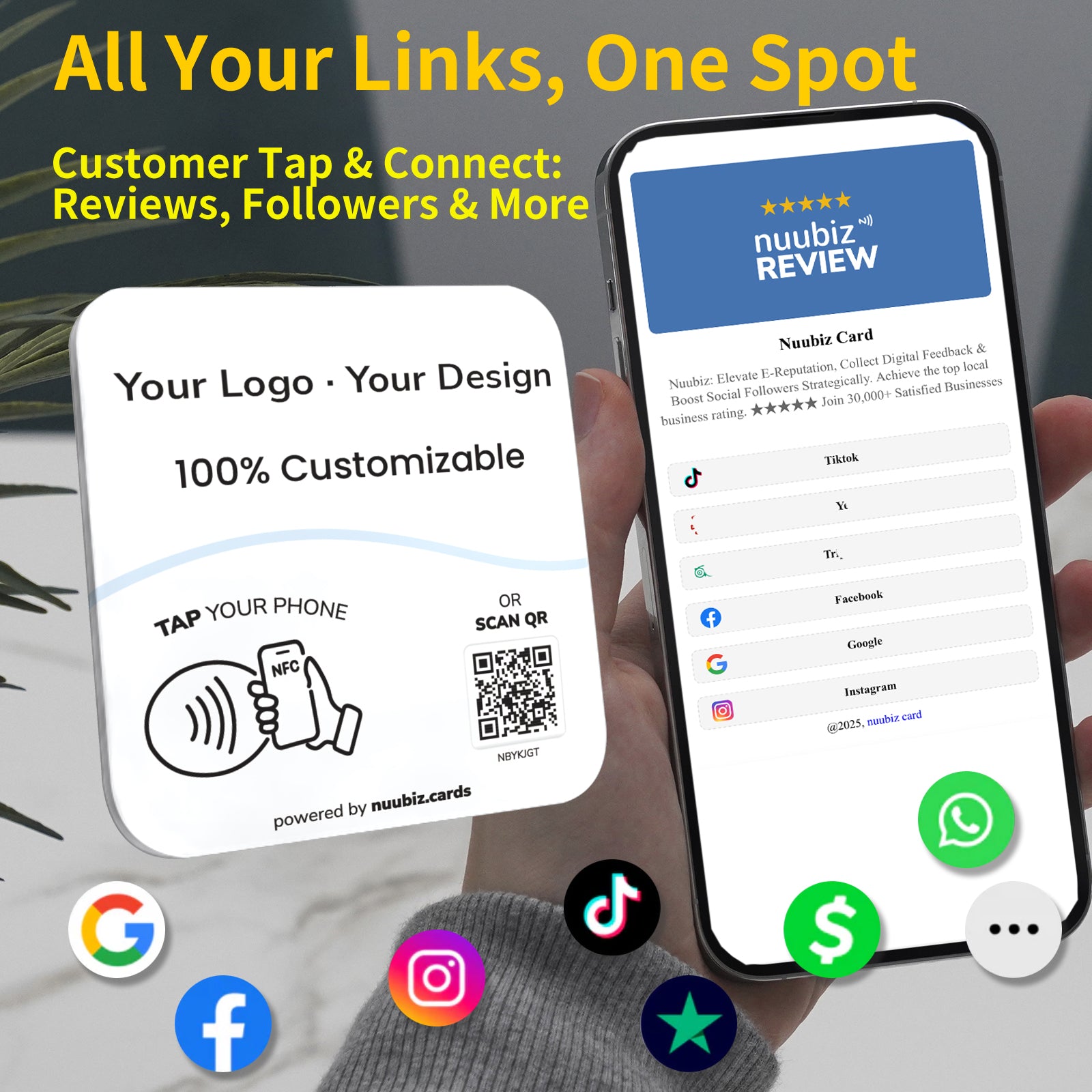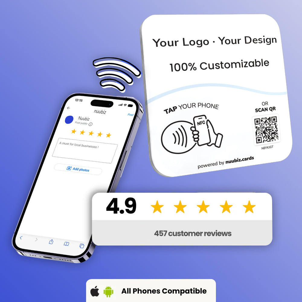 This NFC tap multilink plate helps you build instant credibility and online presence. Upload your business logo, write a short intro, and link out to Google Reviews, Instagram, Facebook, Trustpilot, TikTok, YouTube, Booking, and more. It functions as both a Google review QR code sign and a social media QR code pedestal display, requiring no complicated setup—just activate and display